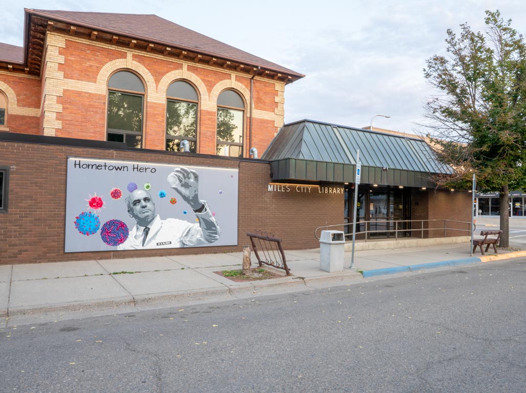 Artwork is located on the 10th St. SIDE of the Miles City Public Library. This piece was created by the very talented CCDHS Art Club in 2025. The work celebrates the work of world renowned scientist Dr. Maurice Hilleman, who was born and raised in Miles City. Hilleman was instrumental in creating over 40 vaccines. This mural was funded by the Nibs and Edna Allen Foundation, Milestown Community Improvement, Inc., Keep Miles City Beautiful, and Miles City Downtown Artwalk.