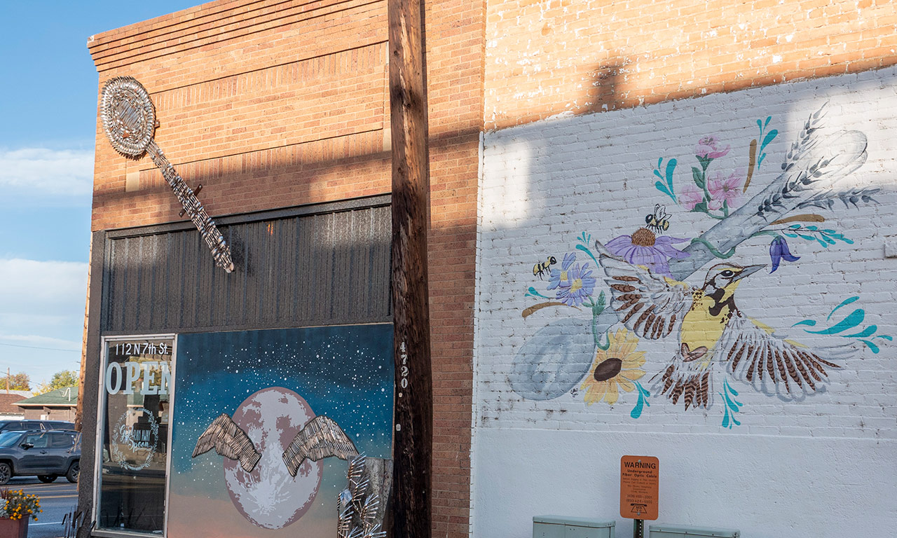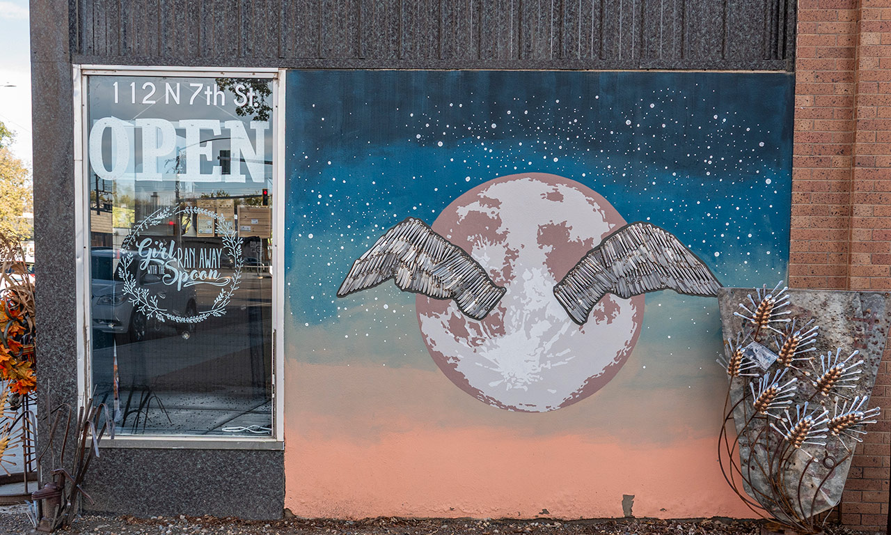 Artwork is located on the SOUTH facing side of Girl Ran Away with the Spoon. The mural was completed by local business owner and artist Erin Thormodsgard and local artist and taxidermist Jenn Hall-Tooke. Completed in 2020.