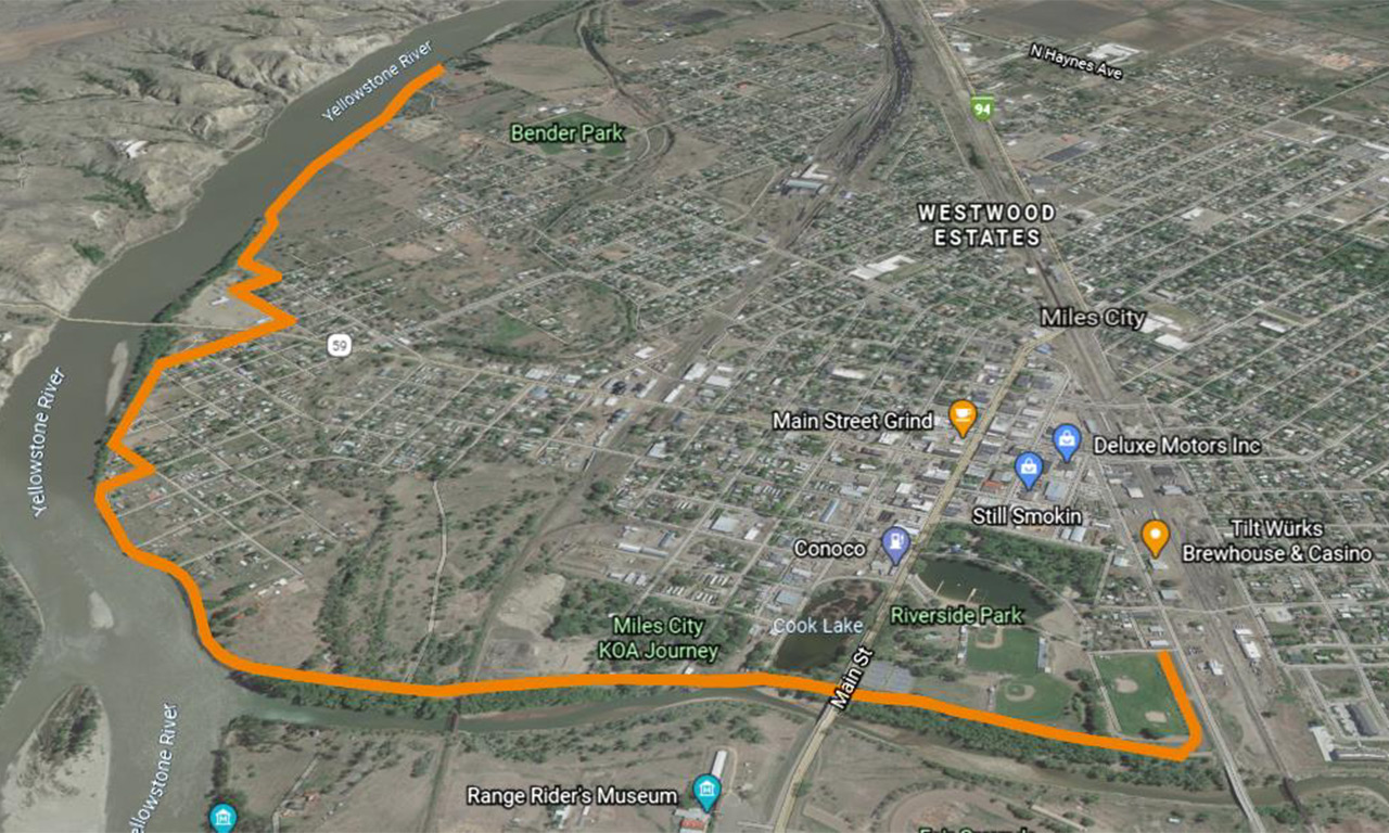 The dike road starts near the Scanlan Lake/Riverside Park Area along Pacific Ave and follows along the bank of the Tongue River until meeting up with the Yellowstone. From there, the road proceeds to follow the bank of the Yellowstone River, crossing Highway 59 via Wells Street, and continuing the bank until ending at N Jordan Ave. The gravel/dirt road is single lane. As mentioned in Interstate Engineering and Peaks to Plains Design 2017 Miles City Long-Range Transportation Plan, “Public feedback related to this plan indicated a desire to capitalize on the Yellowstone River levee reconstruction to integrate a multi-use trail that would provide an outer route around the community”(Interstate Engineering, & Peaks to Plains Design 2017). Designating a walking path along the road would promote an increase in pedestrian safety. Miles City Long-Range Transportation Plan Current Dike Road length: 3.12 mi