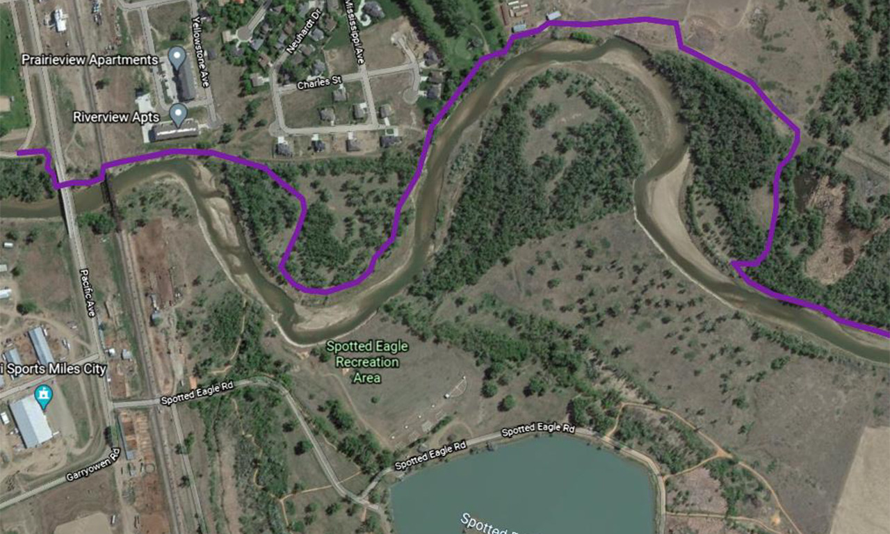 The Tongue River Winery trail is a pathway that connects the Dike Road walkway to the winery south of I-94. The trail is clearly visible up until the Golf course where it fades out and is virtually nonexistent until shortly before the winery in which it follows a two track the last stretch. From Dike Road near Tedesco Field, the trail crosses Pacific Ave and the railroad tracks passing by the Riverview Apartments. The trail then continues behind the adjacent houses. There is a small pathway immediately behind them, as well as a two track that extends as a farther pathway following the river. The pathway immediately behind the houses cuts very close in parts, so taking the extended two track (adds about 0.2 mi) is the better, more considerate route. The trail proceeds to cut farther behind some houses, and then cut closely behind the golf course repair shop. After passing the repair shop, following a two track will lead to a set of splits. Taking the right split for both, the trail will continue down to the bank of the river. From this point, the trail fades out and a designated path is not visible. However, the area near the bank of the river is navigable and can be walked without bushwhacking. This will continue until reaching the interstate in which a path can be taken going under. Walking without a trail will continue for a short while before meeting up with a two track that will lead to the winery. Below is the measurement summary: Dike Road to Riverview Apartments: 0.20 mi Path following immediately behind houses (from Riverview): 0.29mi Recommended long path behind houses (from Riverview): 0.5 mi Houses to repair shop: 0.13 mi Repair shop to first split: 0.15 mi First split to second split: 0.18 mi Second split to freeway: 0.6 mi Freeway to winery: 0.45 mi Total: 2.2 mi