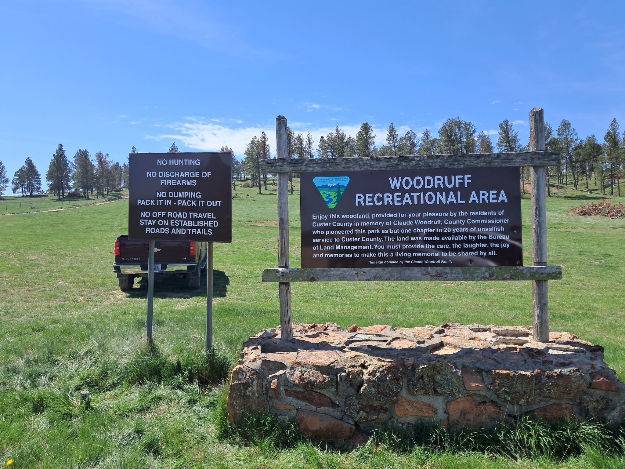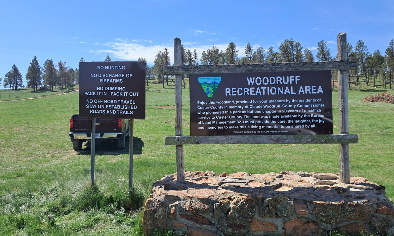 Woodruff Recreational Area (Woodruff Park). Located approximately mile marker 16.3 on Highway 12, toward Baker. Enjoy this woodland, provided for your pleasure by the residents of Custer County in memory of Claude Woodruff, County Commissioner who pioneered this park as but one chapter in 20 years of unselfish service to Custer County. The land was made available by the Bureau of Land Management. You must provide the care, the laughter, the joy and memories to make this a living memorial to be shared by all.